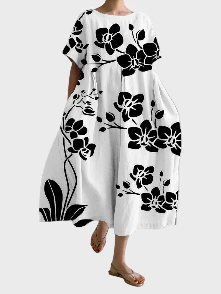 The Whisper of Rose is a dress that exudes romance and understated elegance. The black background with delicate pink flowers creates a sophisticated yet feminine look.