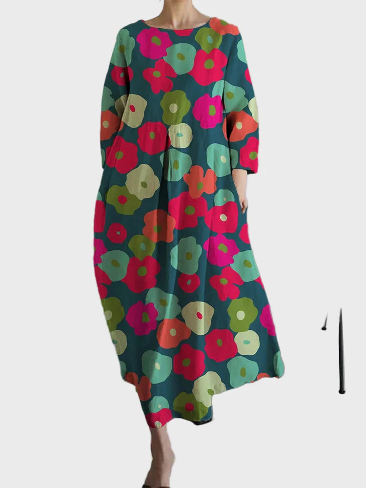 Showcase the cheerful side of your style with this maxi dress featuring colourful flowers in vibrant shades of fuchsia, green, red, and turquoise. Its relaxed fit offers comfort and elegance, while the striking print makes it an ideal choice for everyday wear or summer outings.