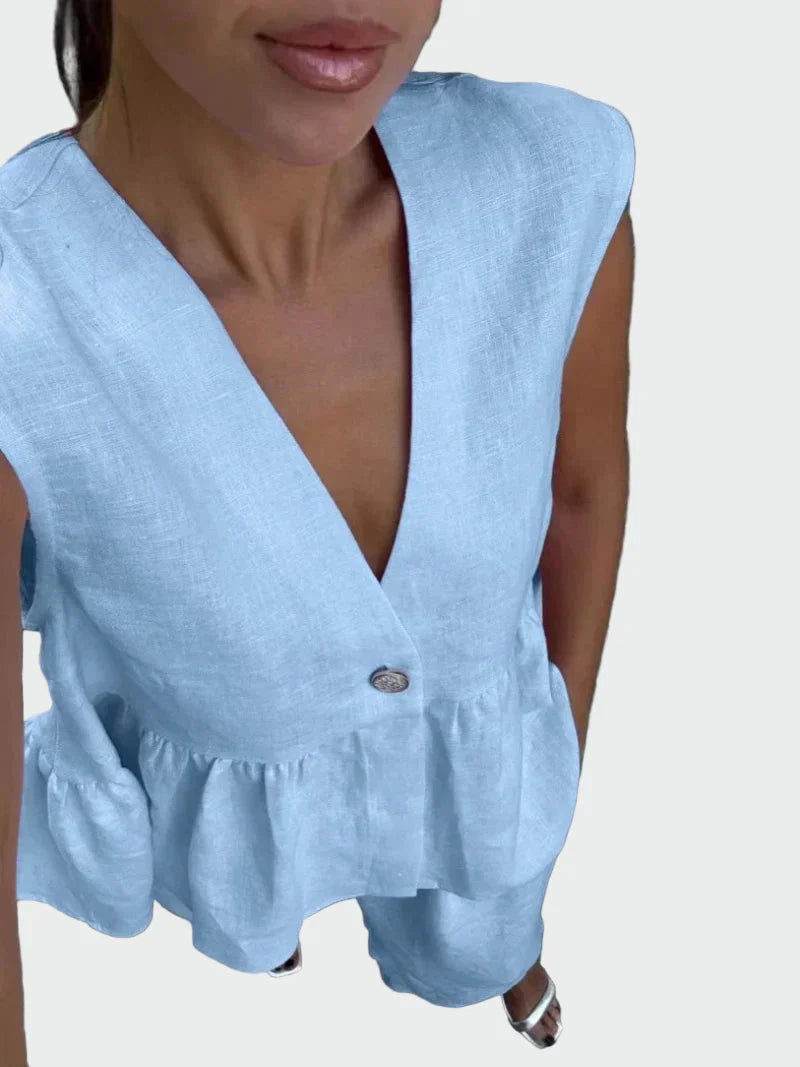 Give your style a light yet elegant feel with this fluid and airy set. Its modern design combines comfort and finesse, making it ideal for both everyday looks and more special occasions. The lightweight fabric provides coolness and ease of movement, while its sleek line adds femininity and style.