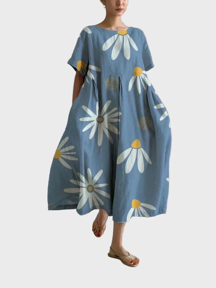 Show off your summer vibe with the Blue Daisy Breeze Dress. The airy blue fabric with large daisy prints creates a cheerful and feminine look that combines comfort and style.