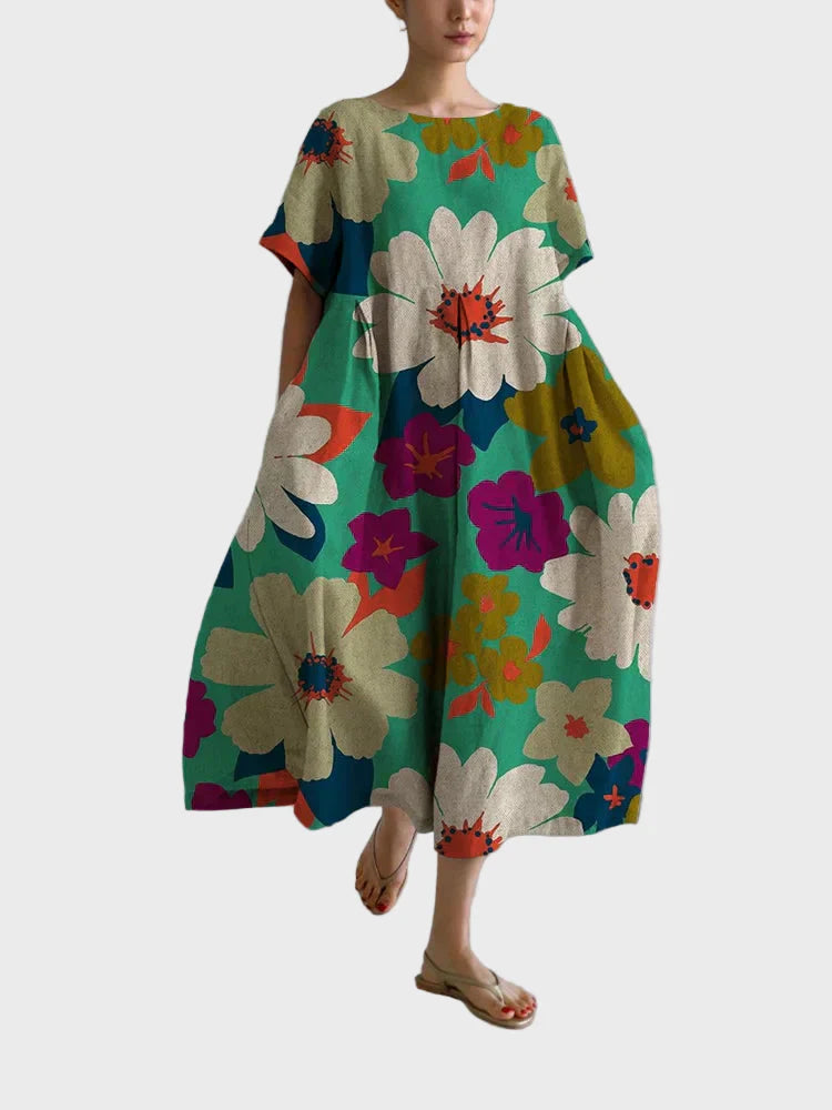 The Blooming Garden dress exudes joy and vibrancy. With a green background and large flowers in bright colours, it is the perfect piece to stand out in any of your summer appearances.