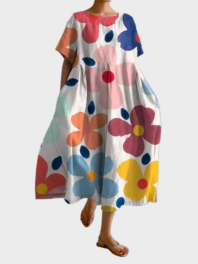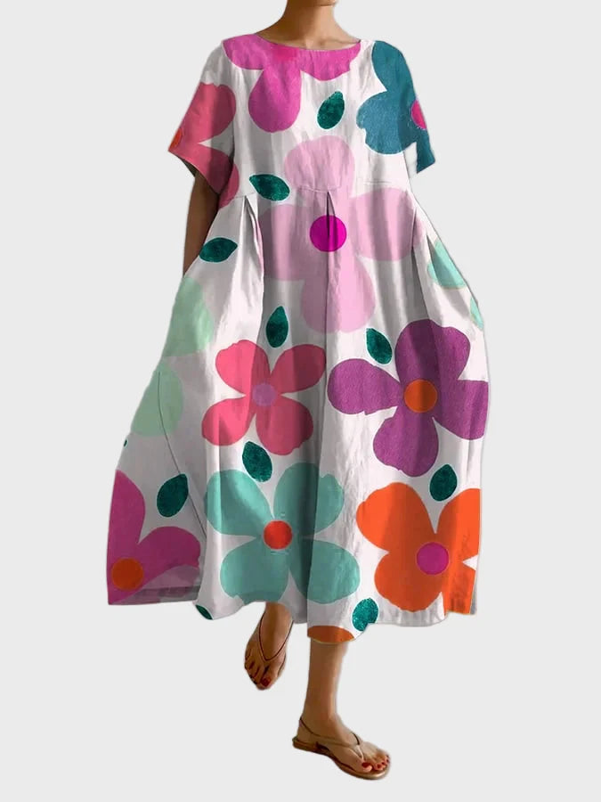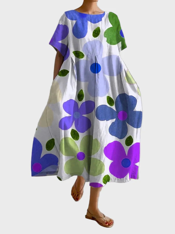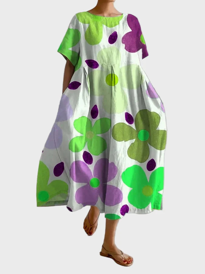 Add colour and vibrancy to your summer with this maxi dress featuring oversized flowers in shades of green, lilac, and purple. The lightweight fabric and relaxed fit make it perfect for everyday outings, beaches, and casual strolls with style and comfort.