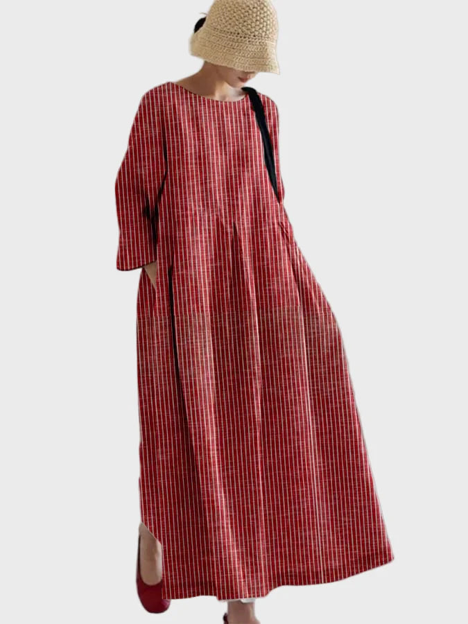 Bring a sense of timeless elegance with this long red dress featuring vertical white stripes. The relaxed fit and three-quarter sleeves provide comfort, while the length adds a refined and airy appearance. Ideal for both casual and more sophisticated occasions.