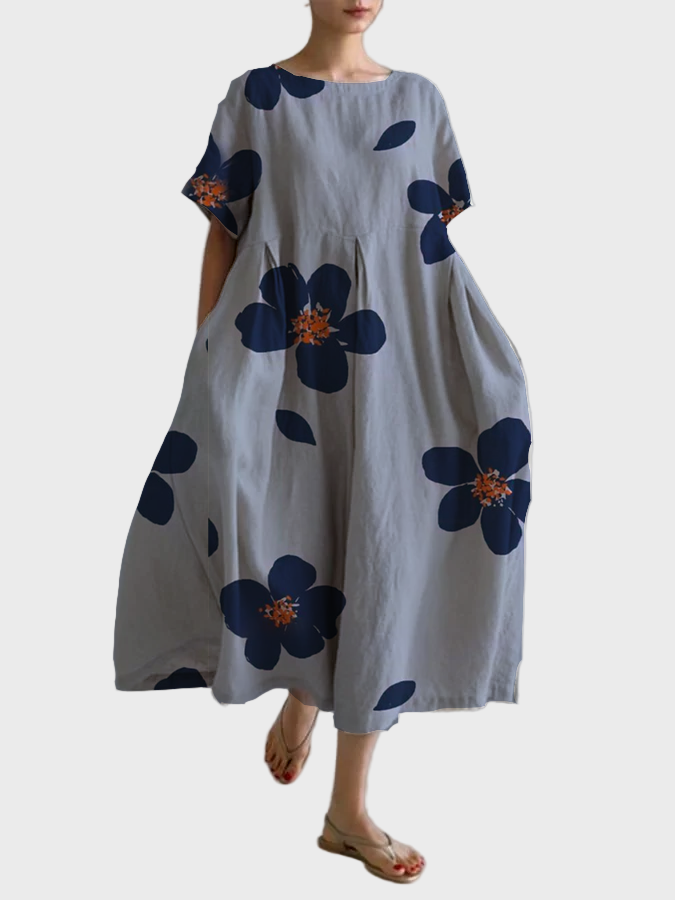 The Grey Blossom Flow Dress combines a minimalist grey tone with striking navy flowers that add vibrancy and style. With a relaxed fit and lightweight fabric, it is the perfect choice for comfort and elegance on any occasion.