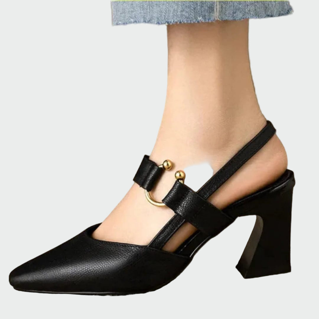 The Black Harmony is a shoe that combines elegance and modern style. The pointed design and unique heel provide a refined appearance, while the golden details add a subtle sparkle.