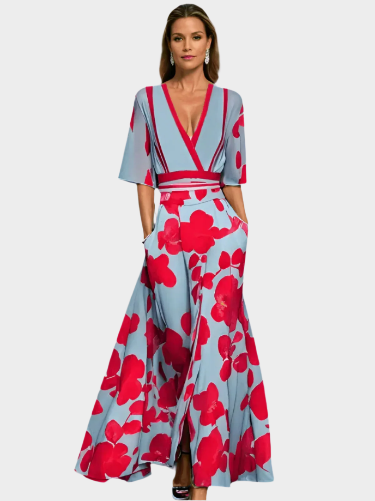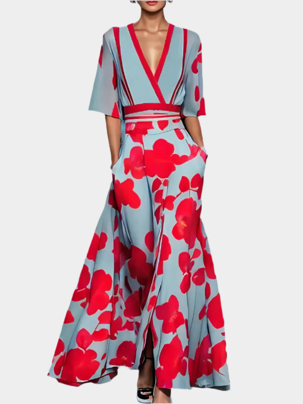 The dress with red flowers and a deep neckline on a light blue base is a statement piece full of confidence and style. Ideal for formal events, summer gatherings, or evening appearances that impress.