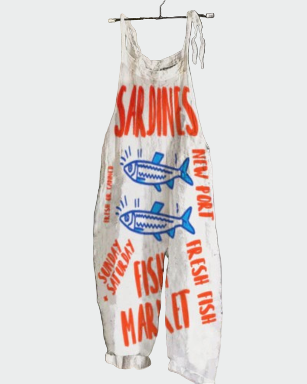 The Fish Market is a unique and playful jumpsuit reminiscent of a vintage fish market poster. The bold red and blue details featuring the words “SARDINES”, “FRESH FISH”, “FISH MARKET” combined with graphic fish create a striking and distinctive look.