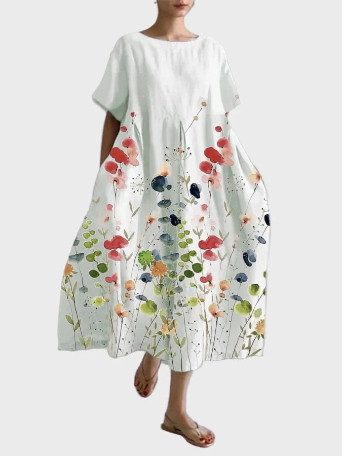 The Watercolour Meadow is a dress that exudes romance and natural elegance. With a white background and a floral design in watercolour style, it is the perfect choice for your spring and summer appearances.